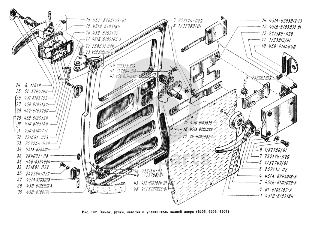 Замок и ручки задней двери, навеска задней двери, уплотнитель задней двери УАЗ 2206