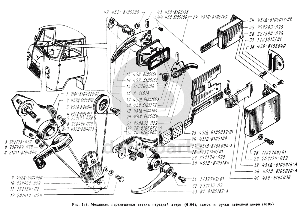 Механизм перемещения стекла передней двери, замок и ручки передней двери УАЗ 3303