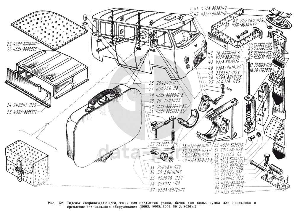 Ящик для предметов ухода, бачок для воды, сумка для поильника, крепление специального оборудования УАЗ 3303