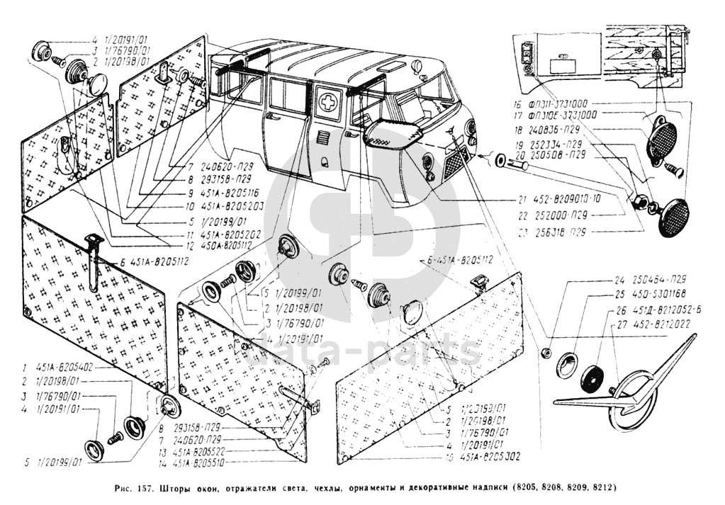 Шторы окон, отражатели свеча, чехлы, орнаменты и декоративные надписи УАЗ 3303