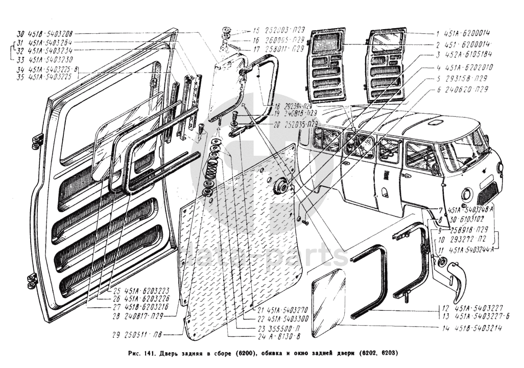 Дверь задняя в сборе, обивка задней двери, окно задней двери УАЗ 3741