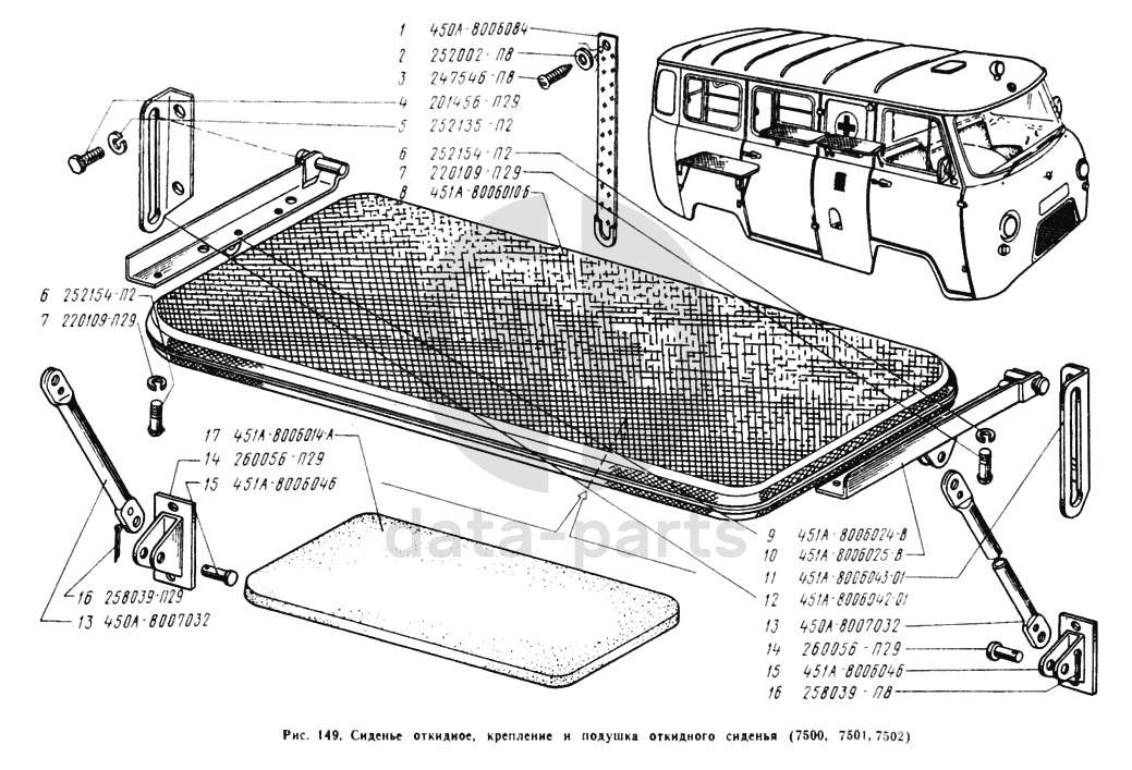 Откидное сиденье в сборе, крепление откидного сиденья, подушка откидного сиденья УАЗ 3741
