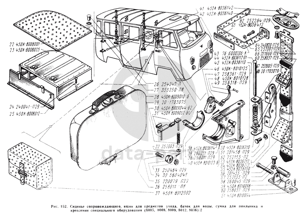 Ящик для предметов ухода, бачок для воды, сумка для поильника, крепление специального оборудования УАЗ 3741