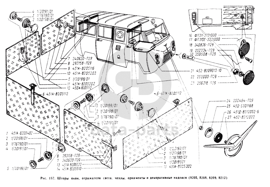 Шторы окон, отражатели свеча, чехлы, орнаменты и декоративные надписи УАЗ 3741