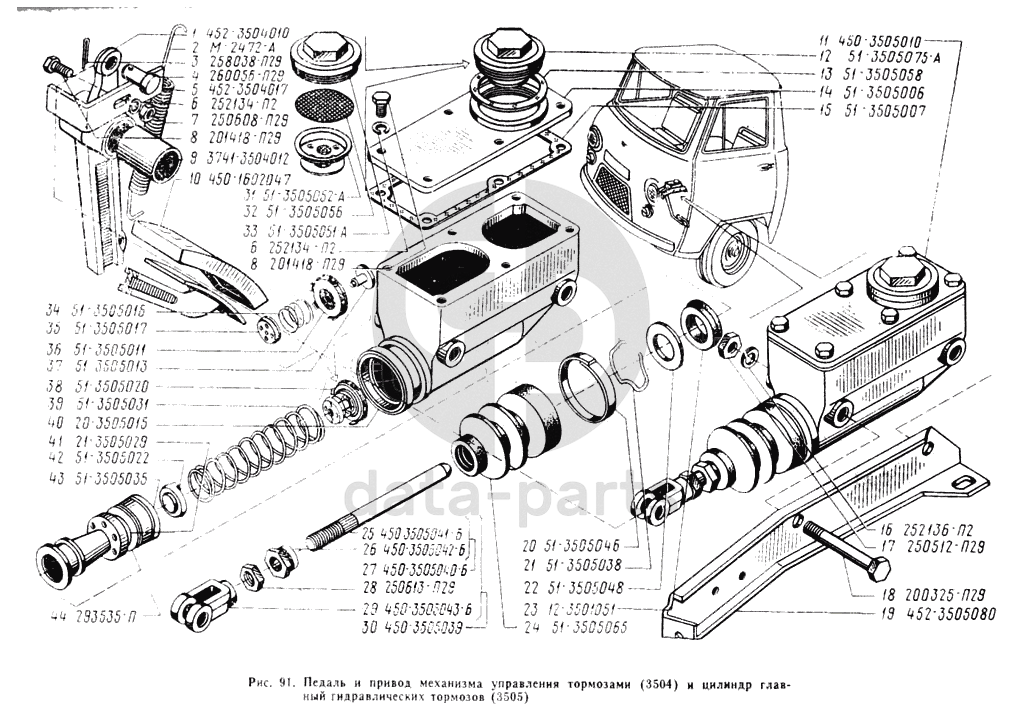 Педаль и привод механизма управления тормозами, цилиндр главный гидравлических тормозов УАЗ 3741
