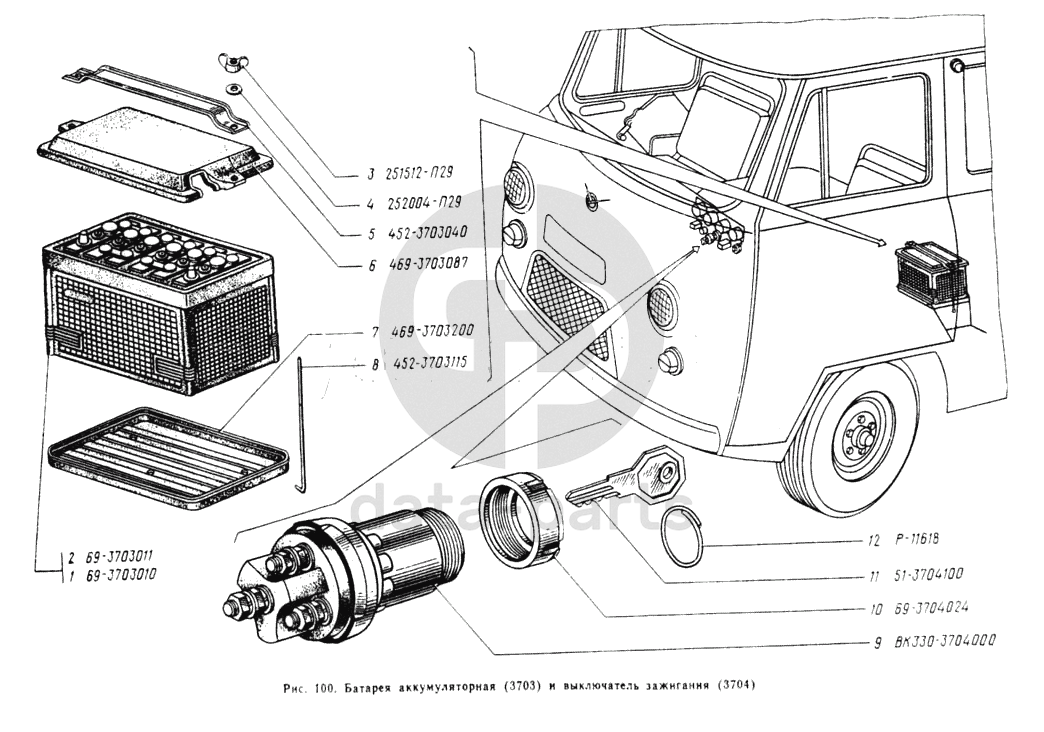 Батарея аккумуляторная, выключатель зажигания УАЗ 3741