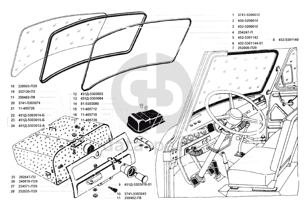 Стекло, уплотнители ветрового окна передок, ящик вещевой УАЗ 3741