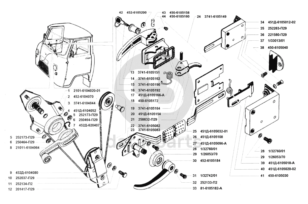 Механизм перемещения стекла передней двери, замок и ручки передней двери УАЗ 3741