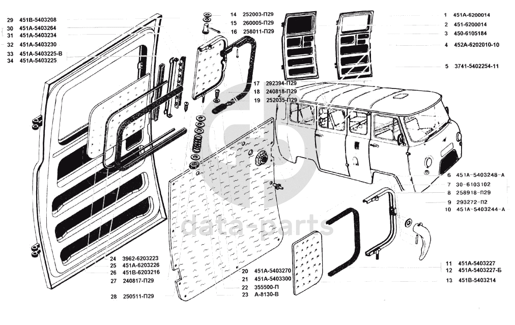 Дверь задняя в сборе, обивка и окно задней двери УАЗ 3741