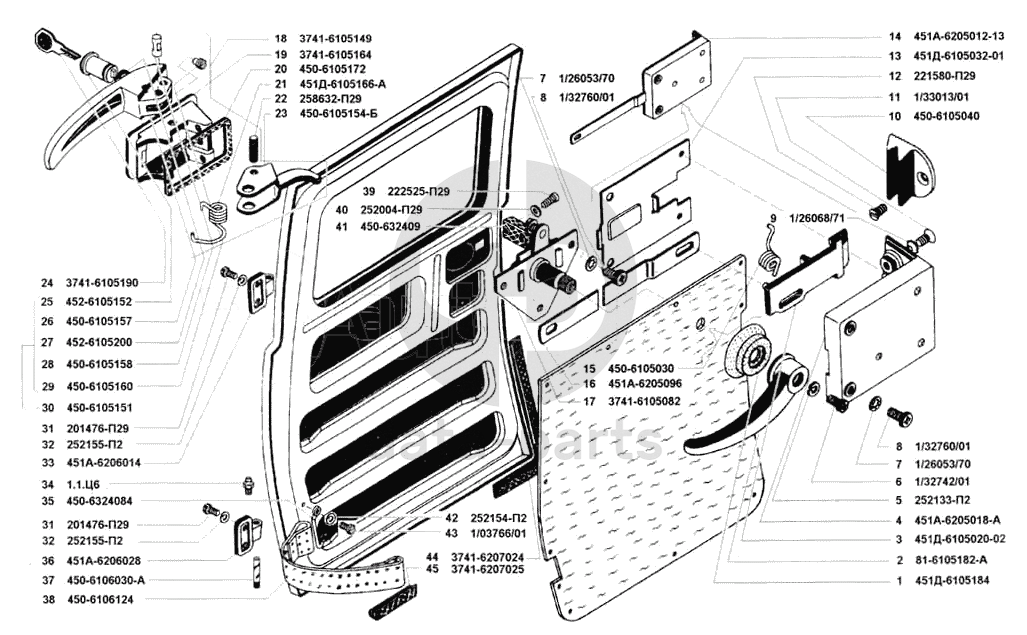 Замок, ручки, навеска и уплотнитель задней двери УАЗ 3741