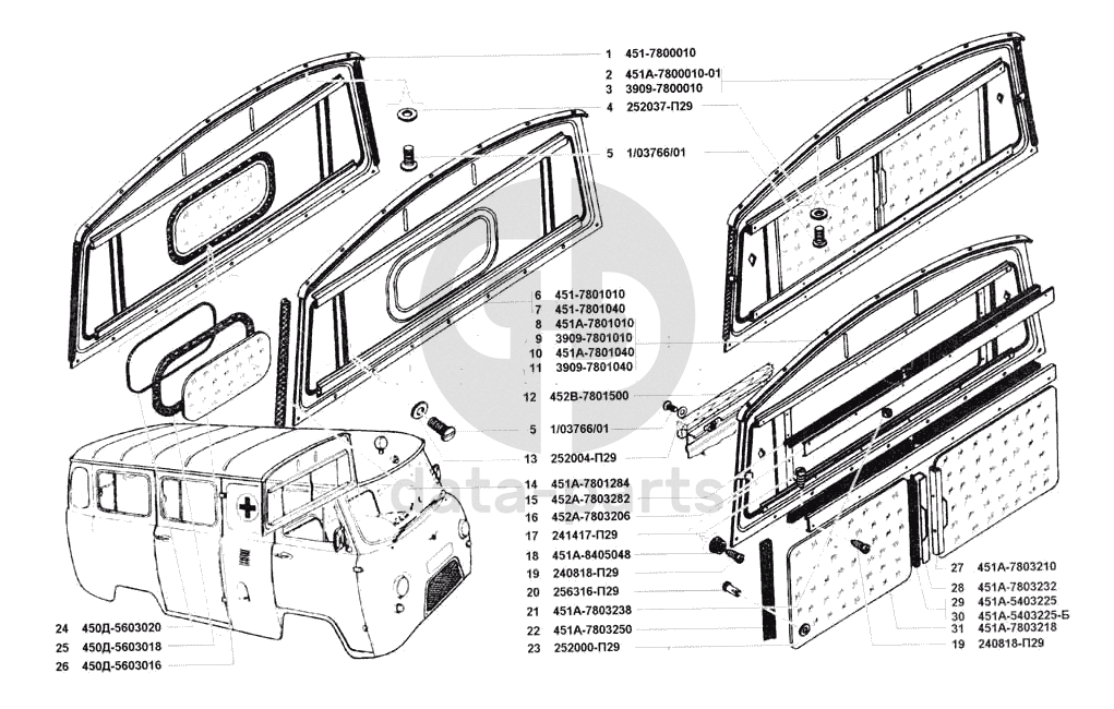 Перегородка кузова в сборе и окно перегородки УАЗ 3741