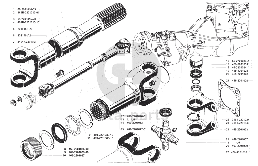 Вал карданный (Состоит из трубы 69-2203018-В, шлицованного конца 469-2201020-10 и вилки 469-2201032)