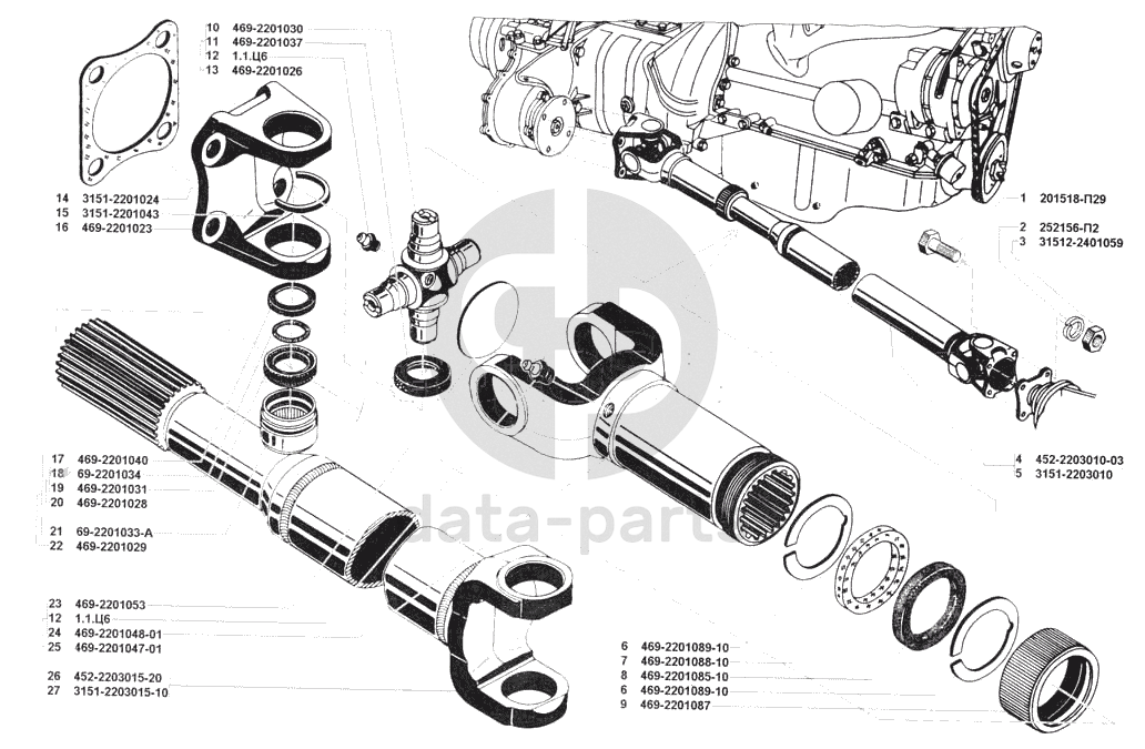 Вал карданный (Состоит из трубы 69-2203018-В, шлицованного конца 469-2201020-10 и вилки 469-2201032)