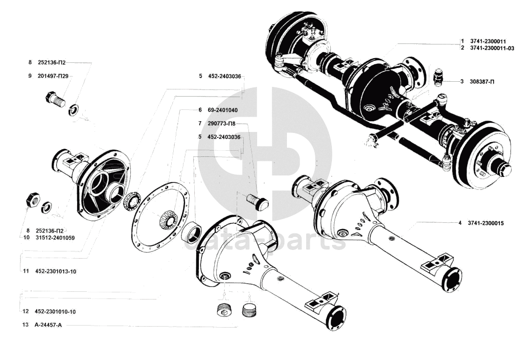 Мост передний ведущий в сборе, картер и кожухи полуосей переднего моста УАЗ 3741