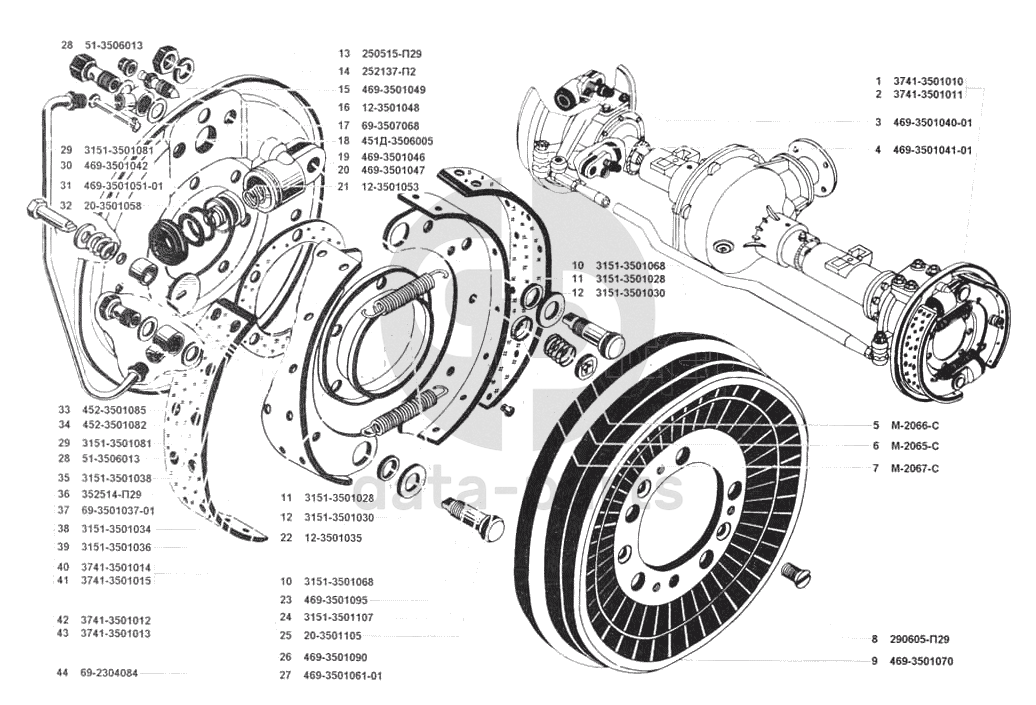 Тормоза рабочие передние и тормозные барабаны УАЗ 3741