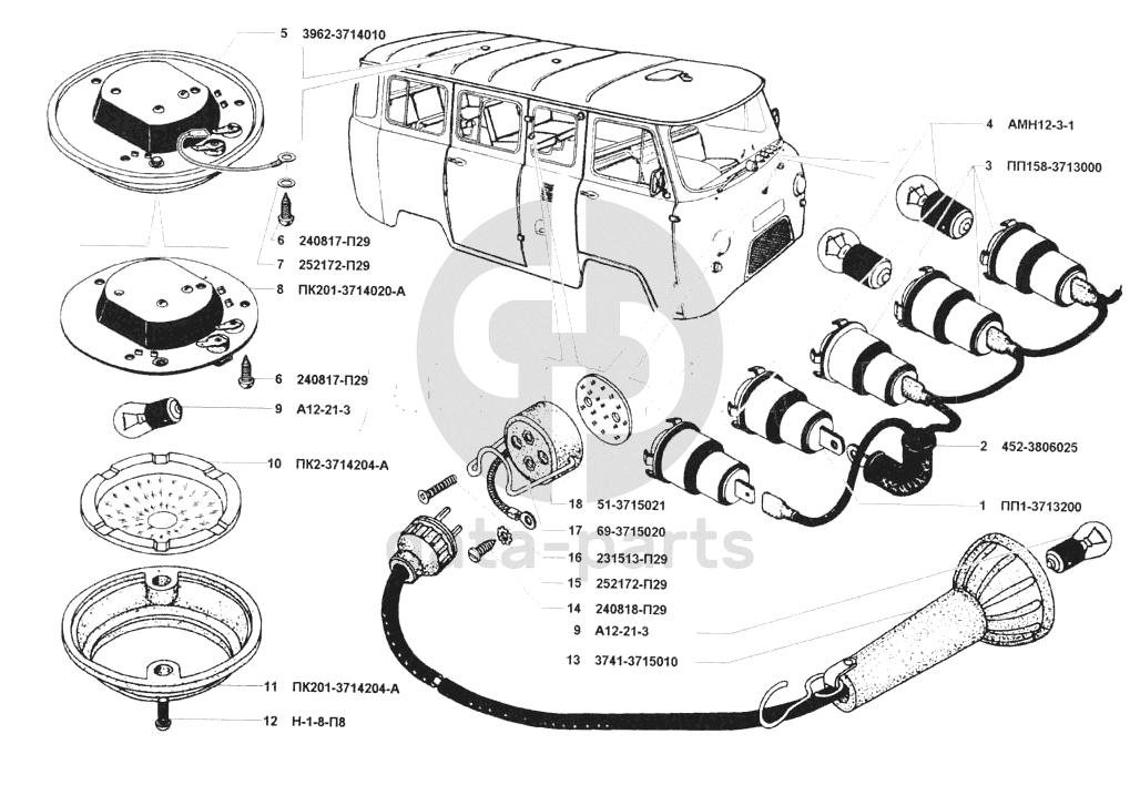 Патроны ламп, освещение кузова внутреннее и лампа переносная УАЗ 3741