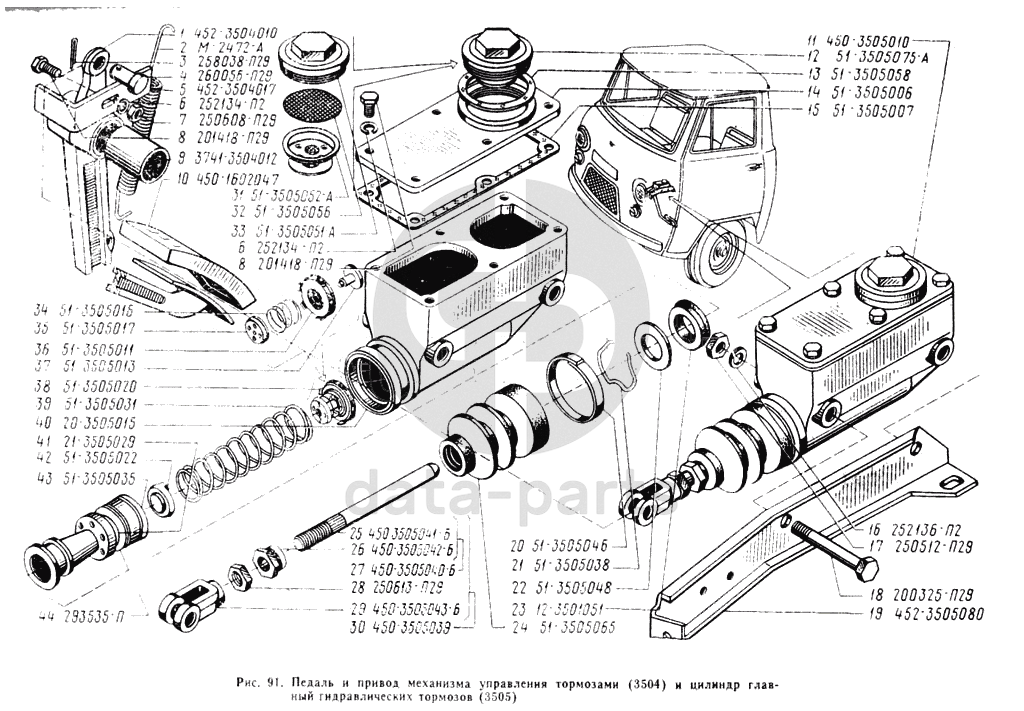 Педаль и привод механизма управления тормозами, цилиндр главный гидравлических тормозов УАЗ 3962