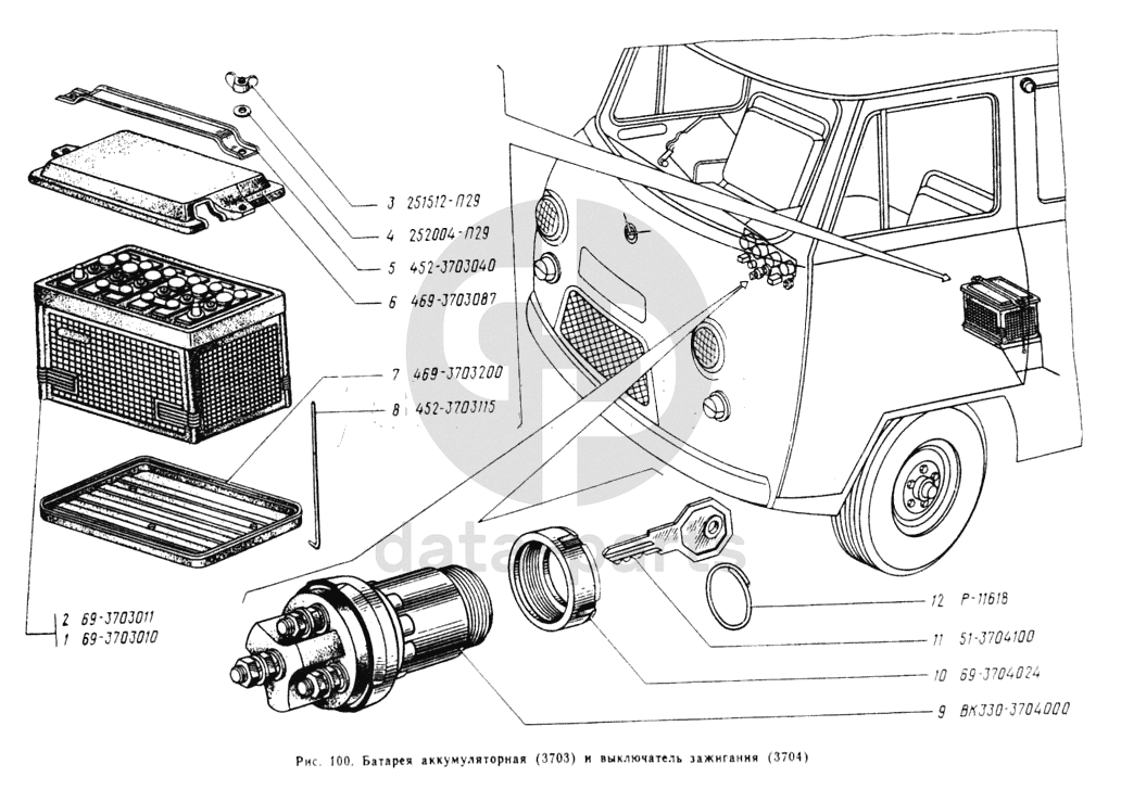 Батарея аккумуляторная, выключатель зажигания УАЗ 3962