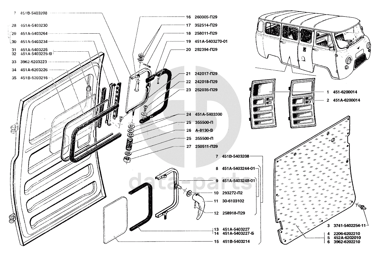 Дверь задняя в сборе, обивка и окно задней двери УАЗ-37419