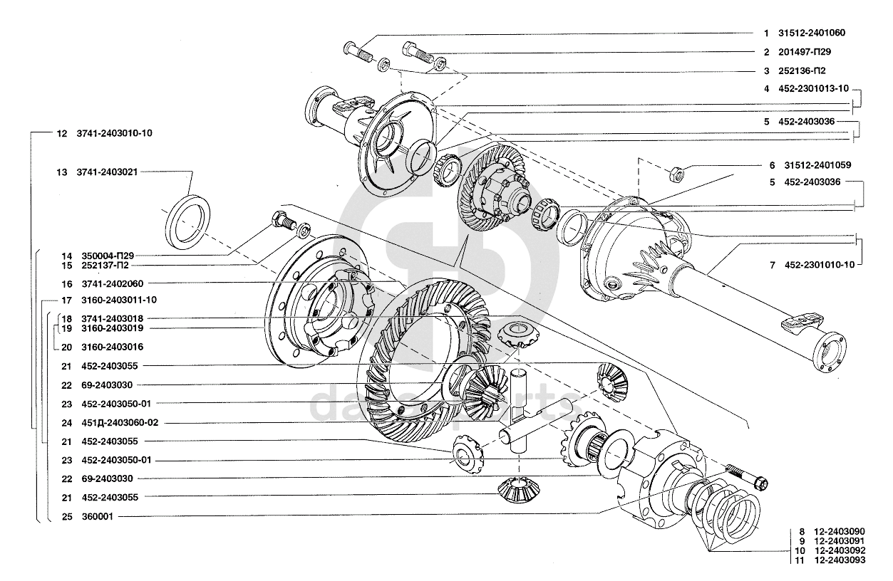 Картер и кожухи полуосей переднего моста, дифференциал переднего моста УАЗ-37419