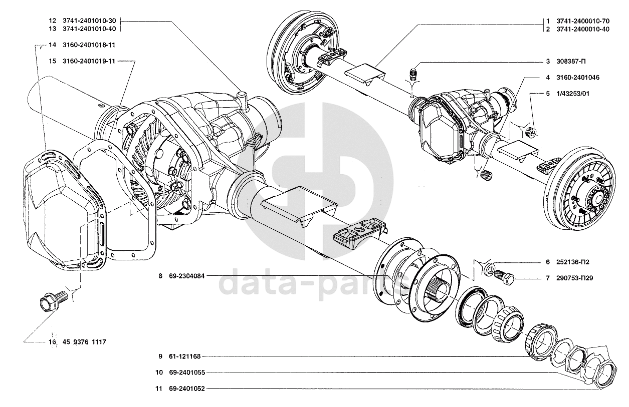 Мост задний ведущий в сборе, картер и кожухи полуосей заднего моста УАЗ-37419