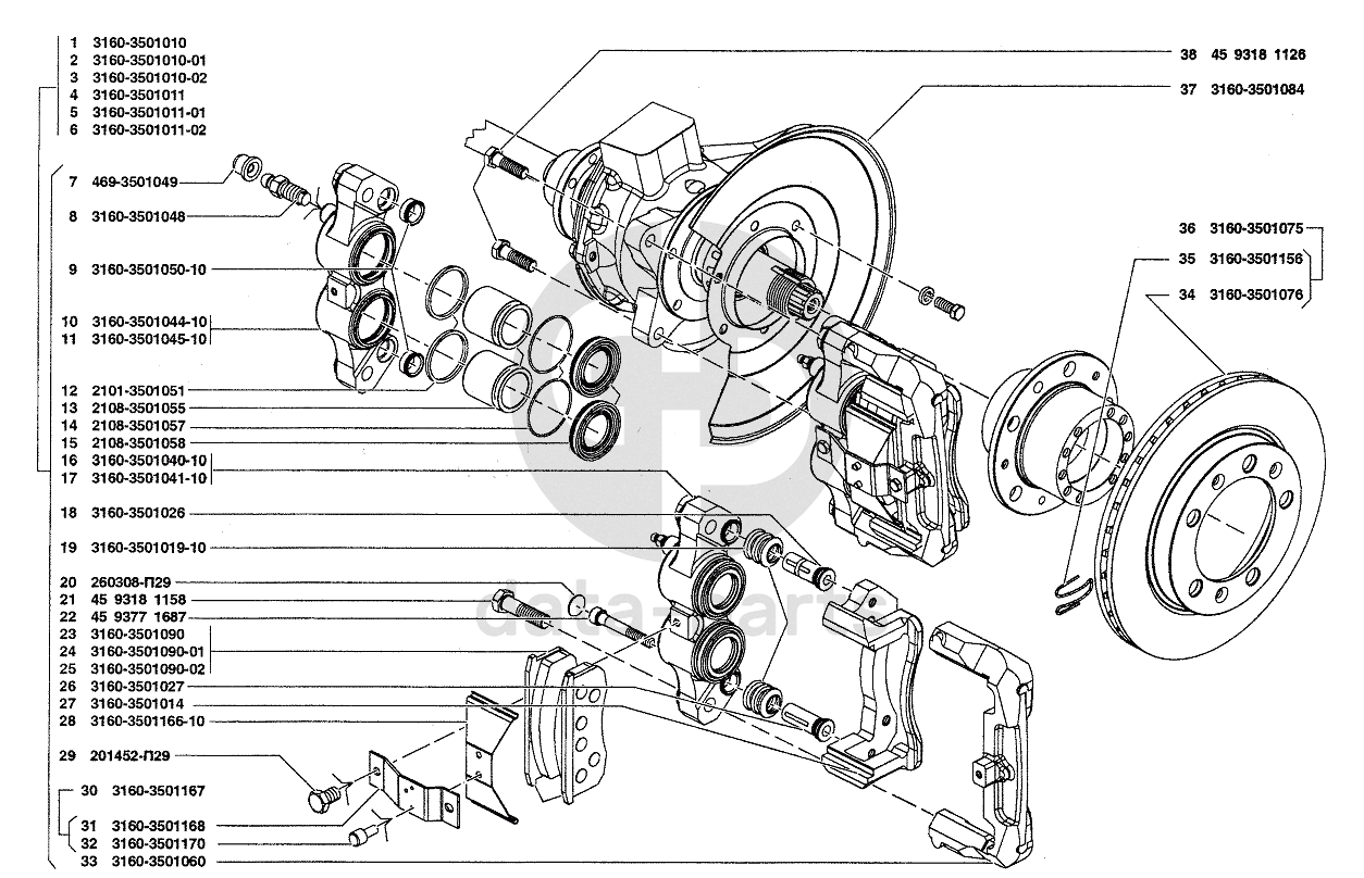 Тормоза рабочие передние и тормозные диски (для моста 3741-2300011-51) УАЗ-37419