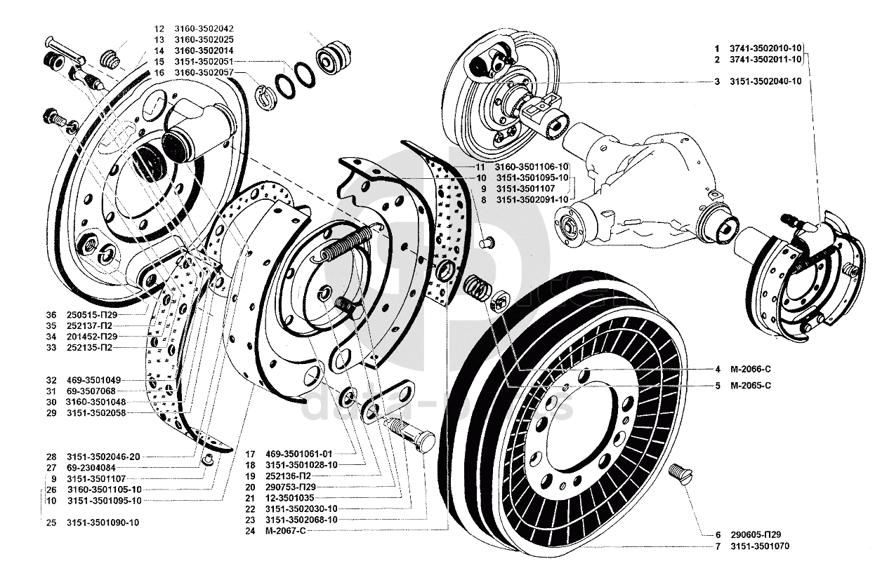 Тормоза рабочие задние и тормозные барабаны (для моста 3741-2400010-70) УАЗ-37419