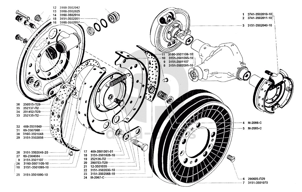 Тормоза рабочие задние и тормозные барабаны (для моста 3741-2400010-70) УАЗ-37419