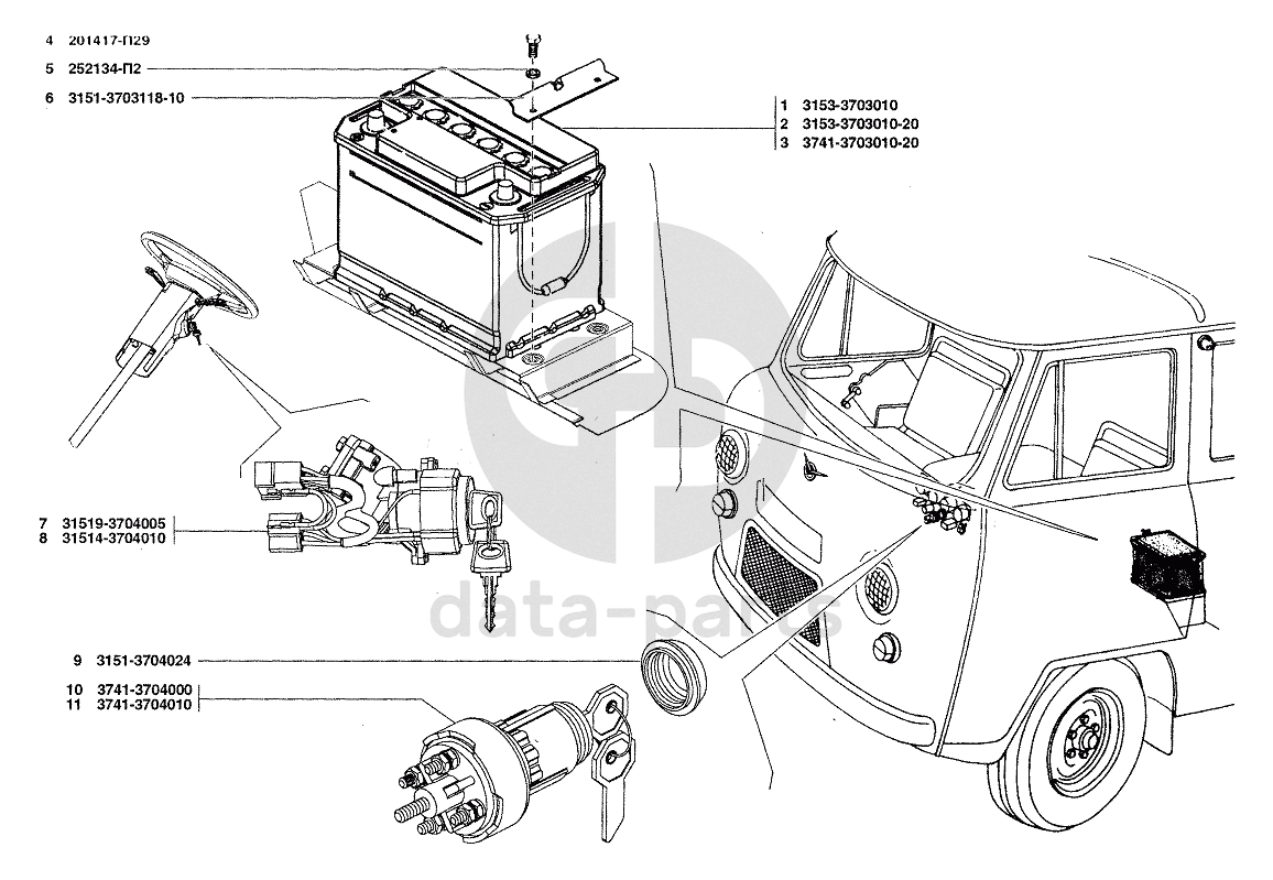 Батарея аккумуляторная, Выключатель зажигания УАЗ-37419