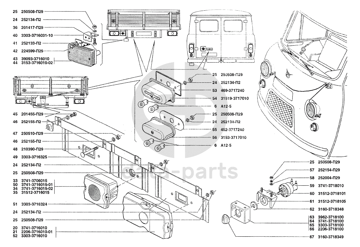 Фонари задние, фонарь освещения номерного знака, гидрокорректор УАЗ-37419