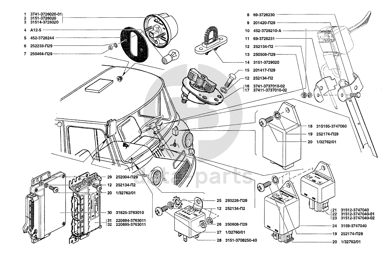 Указатель поворота боковой, выключатель "массы", реле, блоки управления УАЗ-37419