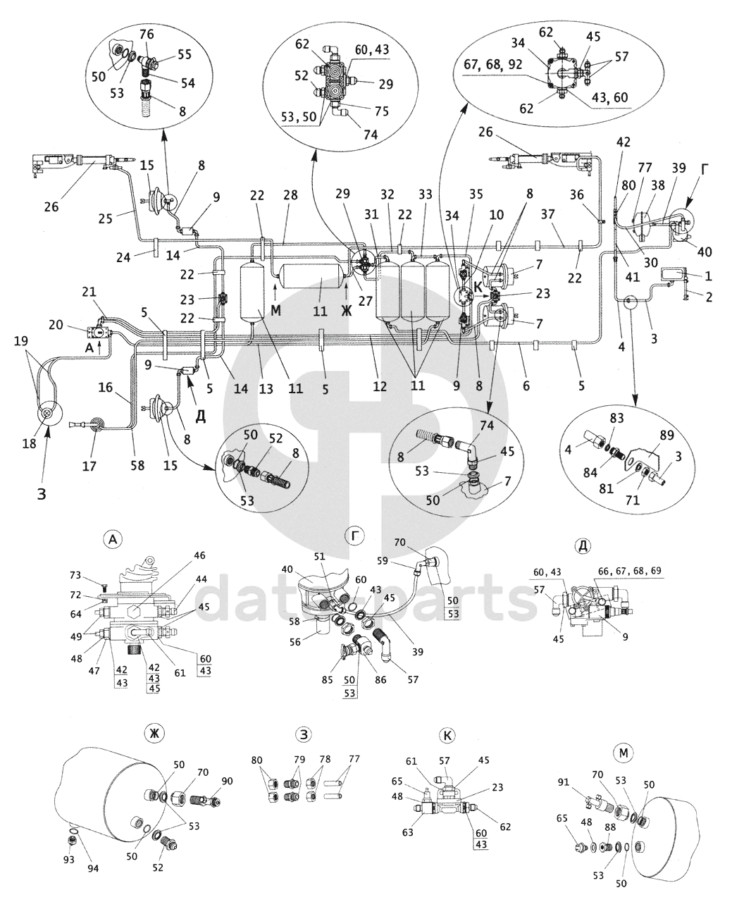 Схема пневматической системы тормозов с пневмоаппаратами ПАЗ-4230
