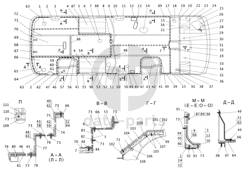 Кожухи арок колес, настил и коврики пола автобуса ПАЗ4234 ПАЗ-4234