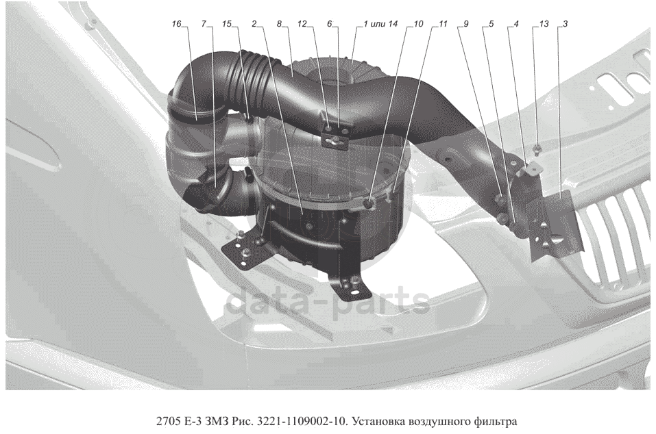 3221-1109002-10. Установка воздушного фильтра ГАЗ-2705 (доп. с дв. ЗМЗ Е-3)