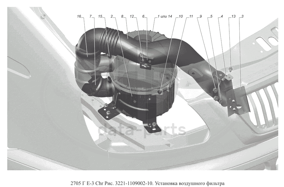 3221-1109002-10. Установка воздушного фильтра ГАЗ-2705 (доп. с дв. Chr Е-3)