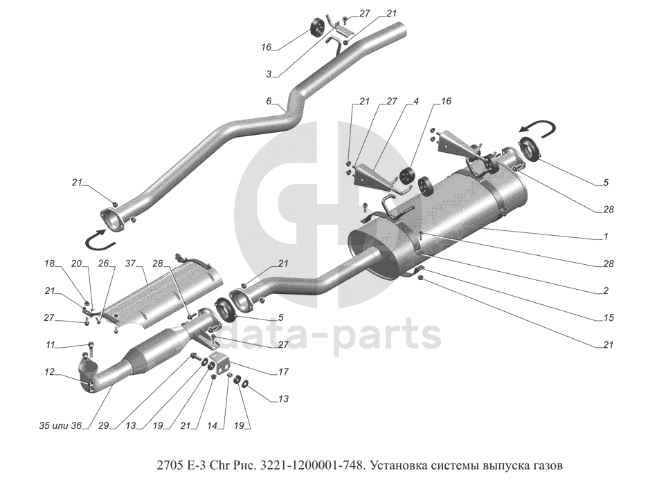 3221-1200001-748. Установка системы выпуска газов ГАЗ-2705 (доп. с дв. Chr Е-3)