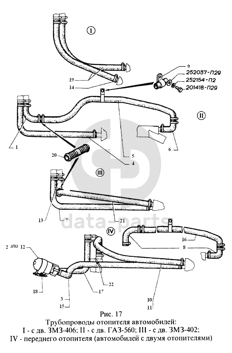Трубопроводы отопителя автомобилей: I-с дв. ЗМЗ-406, II-с дв. ГАЗ-560, III-с дв. ЗМЗ-402, IV-переднего отопителя (автомобилей с двумя отопителями) ГАЗель, Соболь