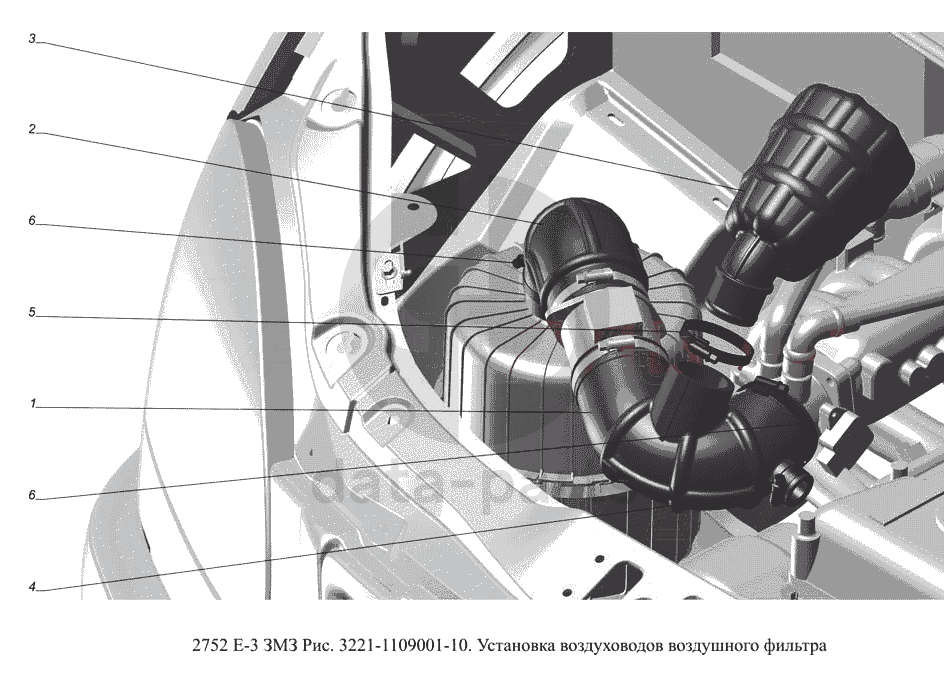 3221-1109001-10. Установка воздуховодов воздушного фильтра ГАЗ-2752 (доп. с дв. ЗМЗ Е 3)