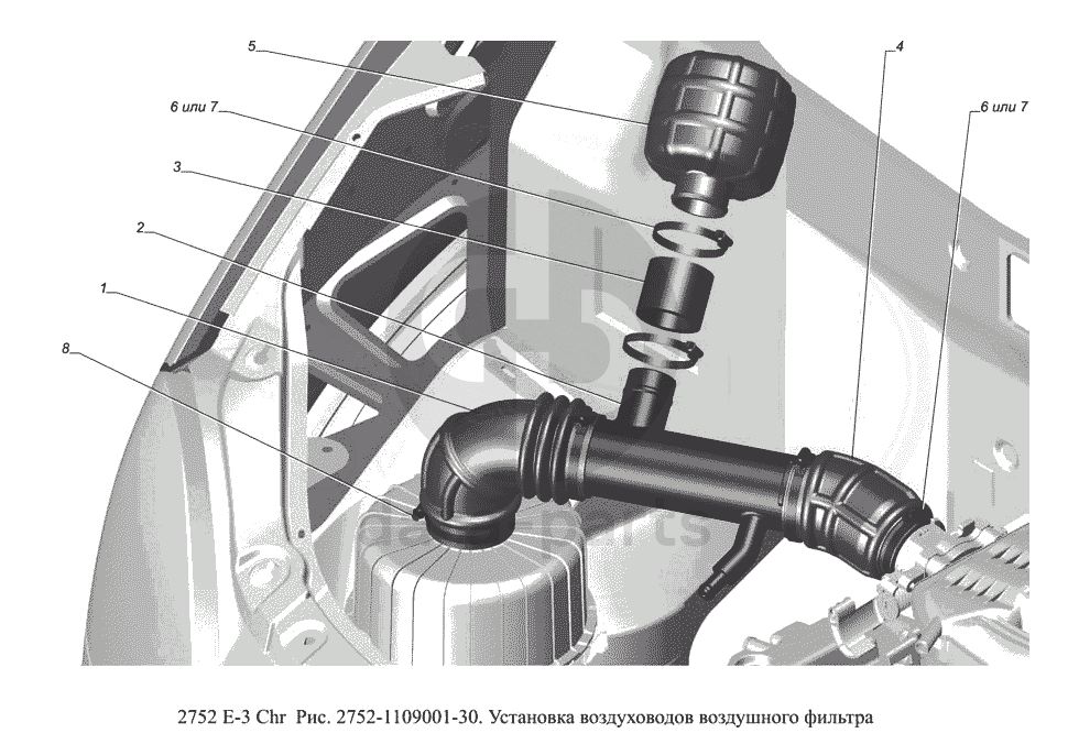 2752-1109001-30. Установка воздуховодов воздушного фильтра ГАЗ-2752 (доп. с дв. Chr Е 3)