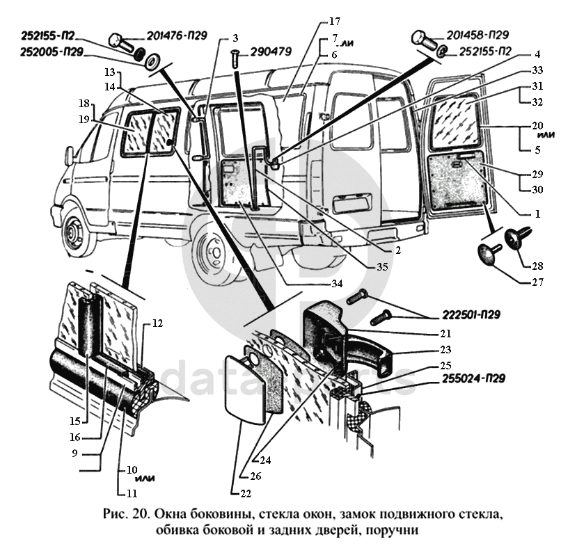 Окна боковины, стекла окон, замок подвижного стекла, обивка боковой и задних дверей, поручни ГАЗ-3221