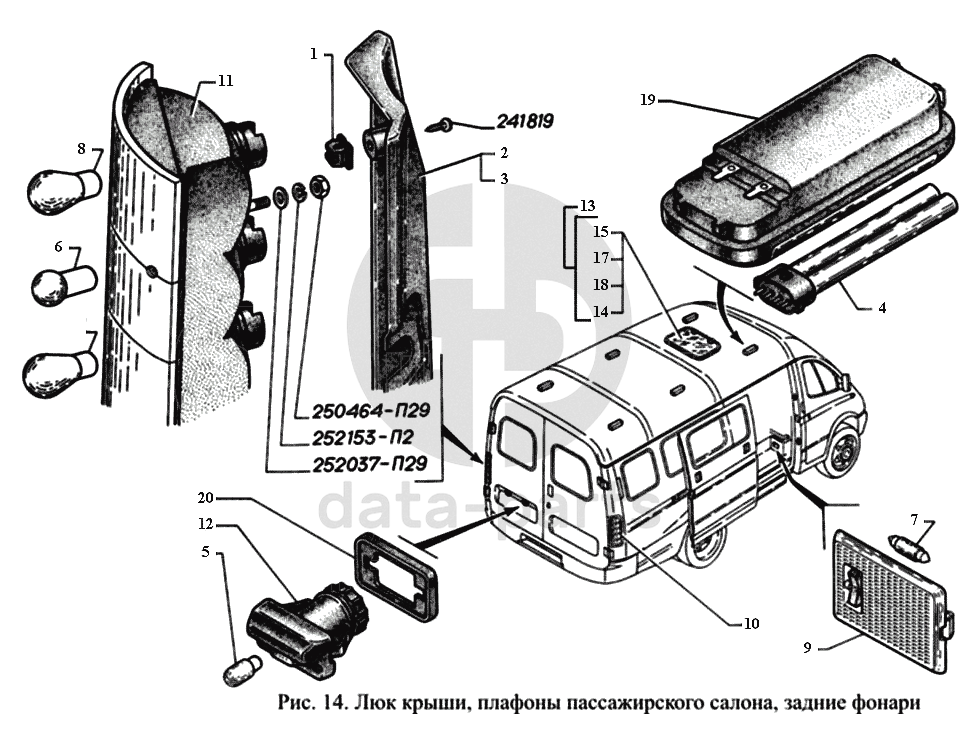 Люк крыши, плафоны пассажирского салона, задние фонари ГАЗ-3221