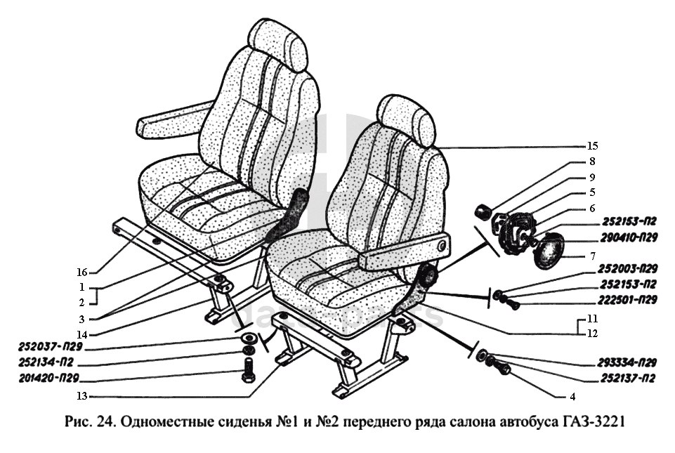 Одноместные сиденья №1 и №2 переднего ряда салона автобуса ГАЗ-3221 ГАЗ-3221