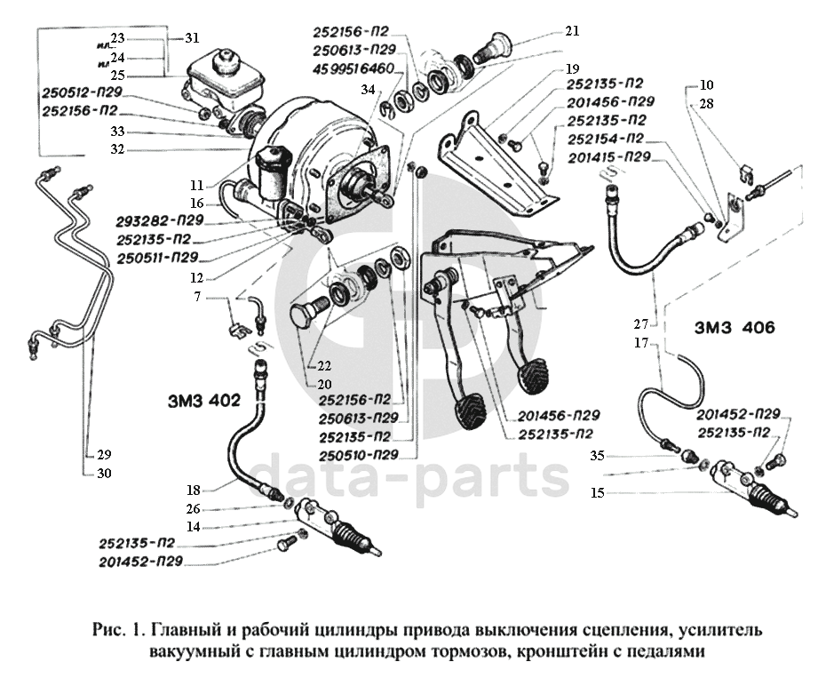 Главный и рабочий цилиндры приводы выключения сцепления, усилитель вакуумный с главным цилиндром тормозов, кронштейн с педалями ГАЗ-3221