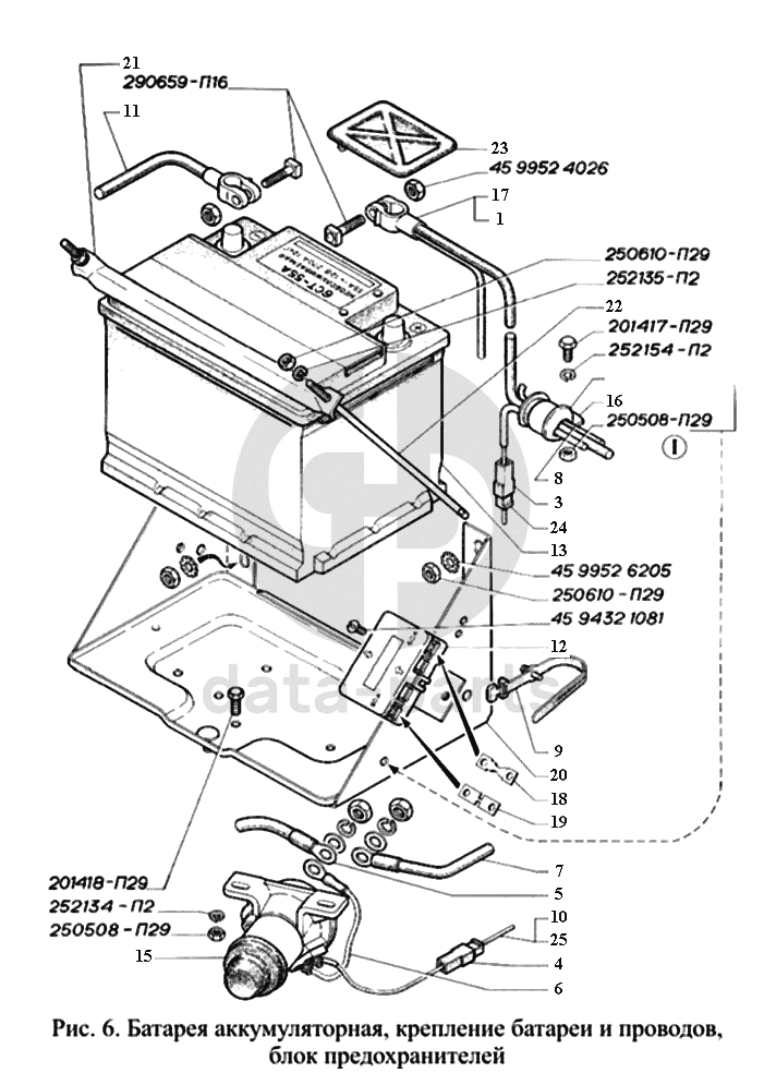Батарея аккумуляторная, крепление батареи и проводов, блок предохранителей ГАЗ-3221