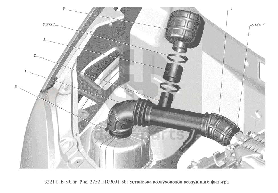 2752-1109001-30. Установка воздуховодов воздушного фильтра ГАЗ-3221 (доп. с дв. Chr Е-3)