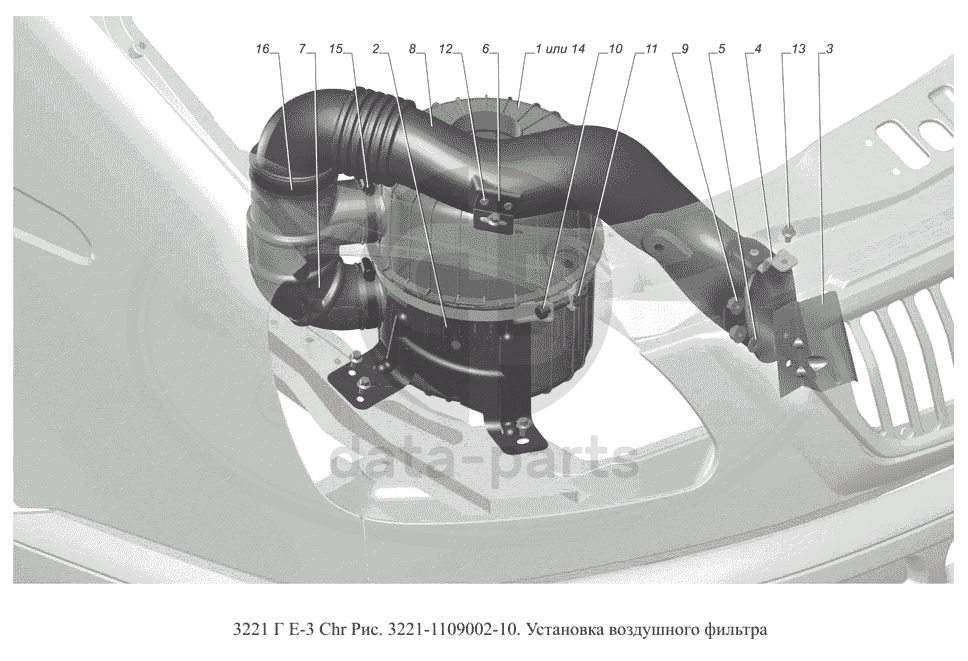 3221-1109002-10. Установка воздушного фильтра ГАЗ-3221 (доп. с дв. Chr Е-3)