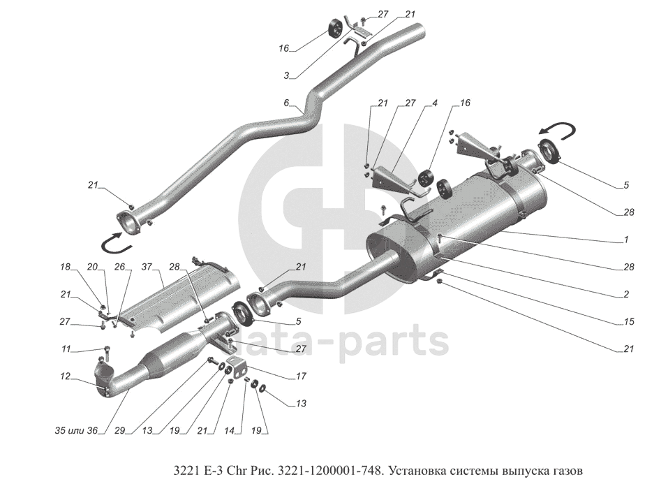 3221-1200001-748. Установка системы выпуска газов ГАЗ-3221 (доп. с дв. Chr Е-3)