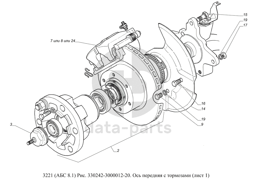 330242-3000012-20. Ось передняя с тормозами колеса ГАЗ-3221 (Уст. АБС 8.1)