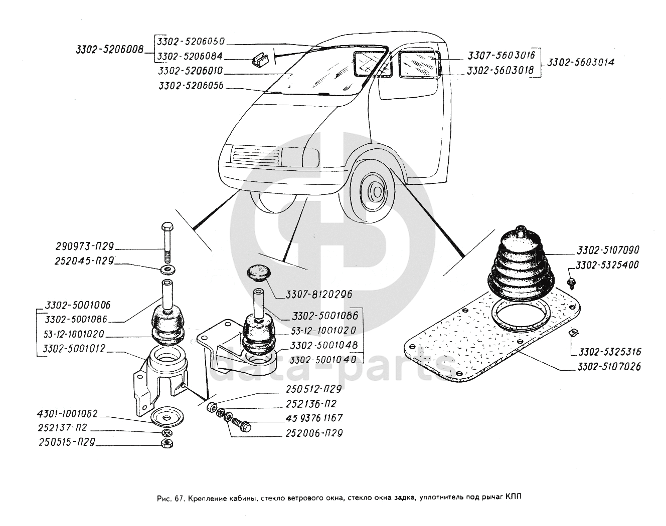 Крепление кабины, стекло ветрового окна, стекло окна задка, уплотнитель под рычаг КПП ГАЗ-3302 (ГАЗель)