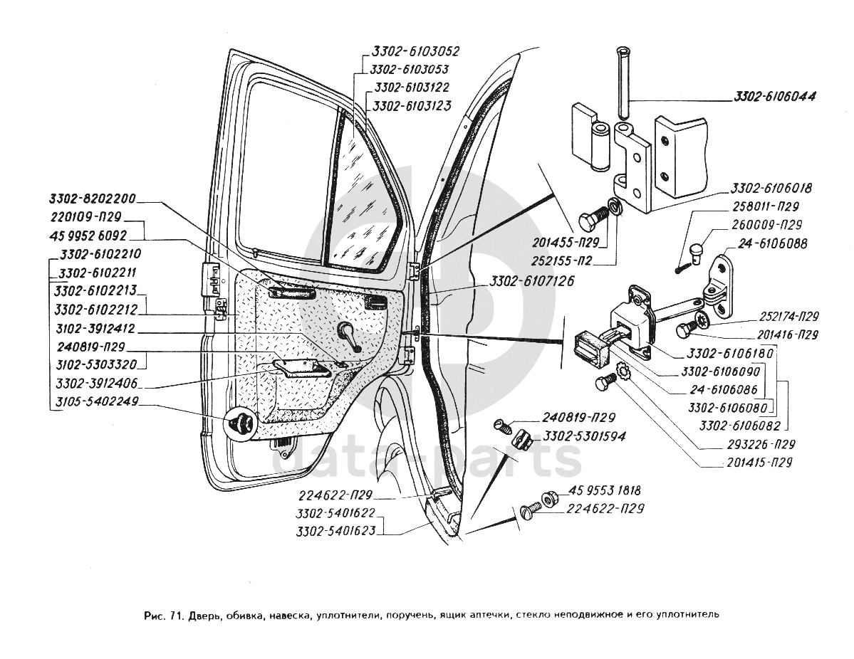 Дверь, обивка, навеска, уплотнители, поручень, ящик аптечки, стекло неподвижное и его уплотнитель ГАЗ-3302 (ГАЗель)